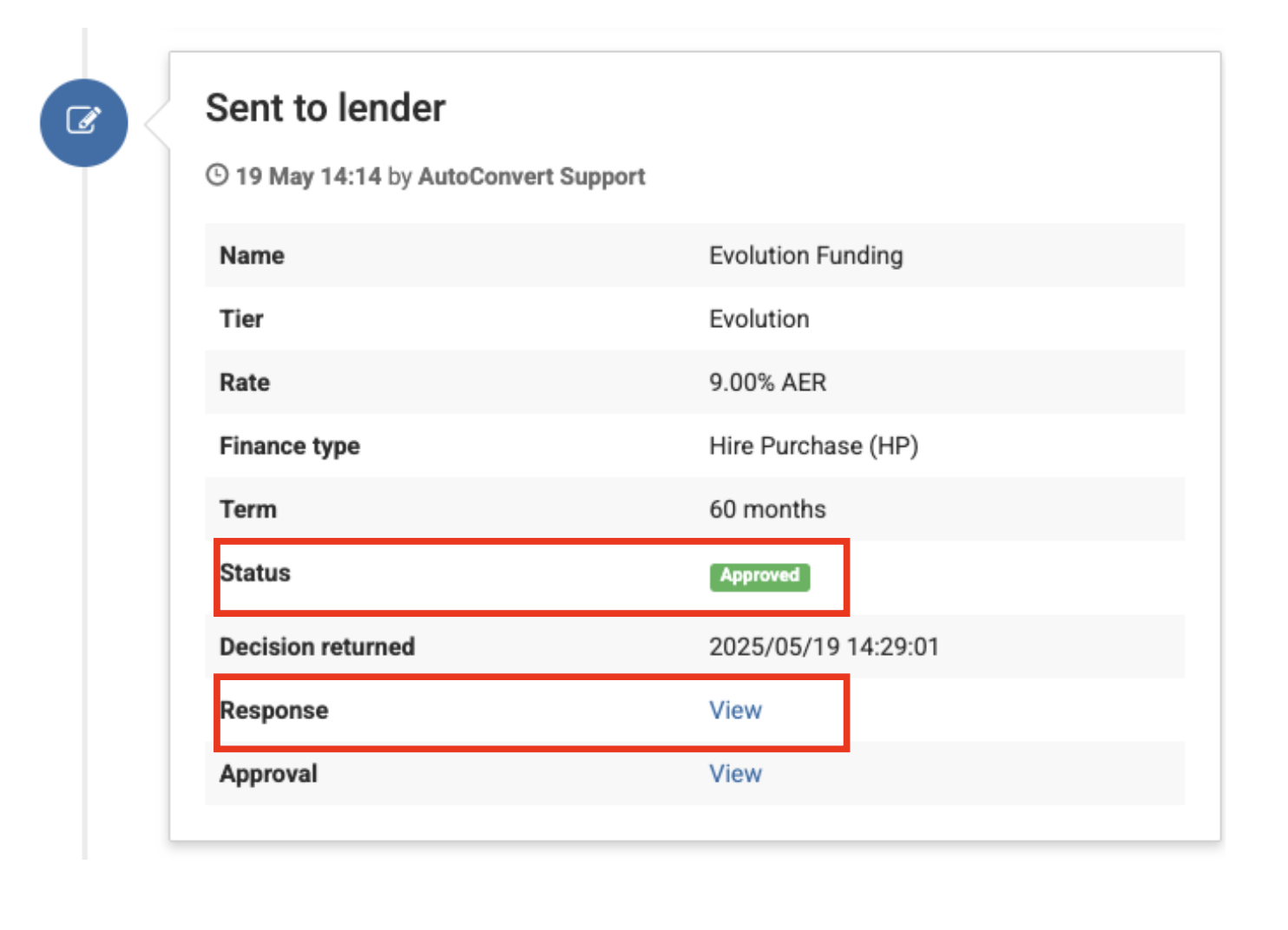 - Selecting 'View' on the 'Response' line in the Sent to lender section will show the information returned by the lender. You'll be able to see timestamps associated with decision timeframes.