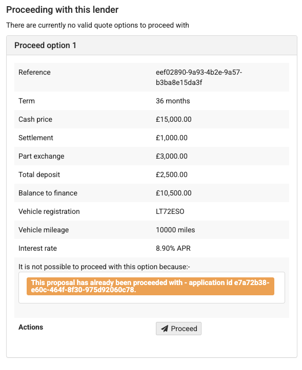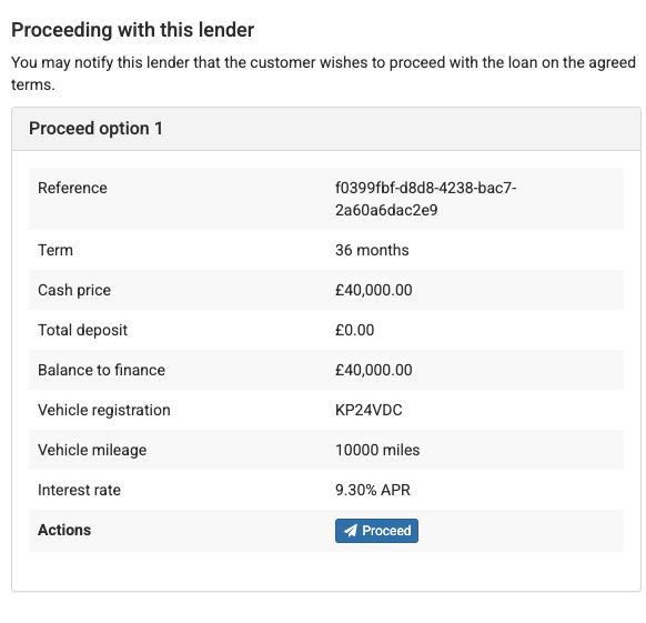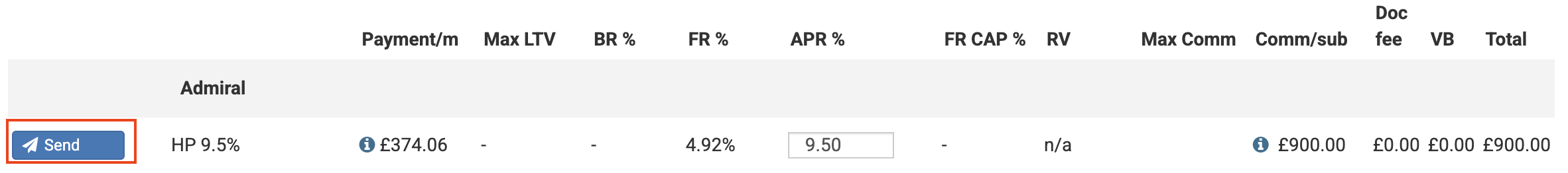 - The rate of approval and commission amounts in the response are the confirmed amounts based on the vehicle and figures applied for. When progressing to the full proposal these will remain as long as none of the details change.