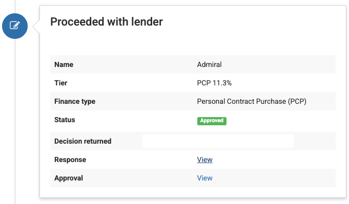 - Selecting 'View' next to 'Response' in the Sent to lender section will show the information returned by the lender. You'll be able to see timestamps linked to decision timeframes.