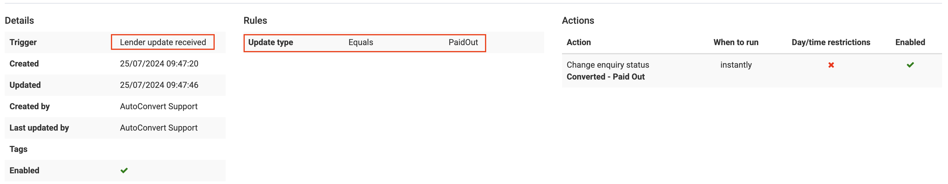 The automation trigger is 'lender update received'. The rule is 'update type equals PaidOut' and you can then run whatever action you wish, e.g create task.